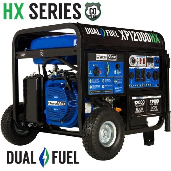 The XP12000HX is the BEAST of the HX Series with 12,000-Watt of POWER. This unit provides the power normally found in stationary home standby generators but in a more affordable, portable package. With a 457cc OHV Duromax Engine, this workhorse is PERFECT for HOME BACK-UP and can power most household essentials such as lights, appliances and even central A/C systems during any power outage, storm or emergency event. BE READY FOR ANYTHING with Duromax’s ALL NEW- HX Series. This brand new, Dual Fuel portable generator lineup features ” CO Alert Technology” that will automatically shut down the generator if an unsafe level of carbon monoxide is detected. Protect your loved ones and enjoy safe and easy operation with Duromax. For questions regarding service or repair please call the customer service line 1-844-DUROMAX, or reference the Service & Repair Document All-new control center with a digital multi-meter, push-button start and a front-facing fuel interface allowing you to change your fuel type in seconds, the digital multi-meter displays voltage, frequency, total hours run and hours until the recommended maintenance Equipped with Duromax CO alert technology that will automatically shut down the generator if an unsafe level of carbon monoxide is detected Built using a powerful 460 cc OHV Duromax engine and features all copper windings designed to make your generator last for years Fully loaded power panel includes four 120-Volt GFCI household outlets, one 120-Volt 30 Amp outlet, one 120-Volt/240-Volt 30 Amp twist-lock outlet and a heavy-duty 120-Volt/240-Volt 50 Amp outlet making it transfer switch ready Onboard the XP12000HX are individual circuit breakers, idle control and a low oil sensor