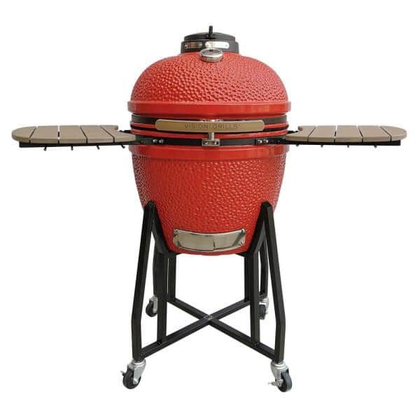 Enter the world of Kamado cooking with the Vision Grills HD1 Kamado Charcoal Grill with a total of 302 sq. in. of cooking space. The ceramic design and shape creates a well-insulated convection environment that enables you to sear, grill, smoke and bake pizzas. Includes wood-sculpted thermoplastic drop-down side shelves with accessory hooks, single tier stainless steel flip cooking grate, integrated thermometer and sturdy steel wheeled cart with 2 locking casters. 302 sq. in. of cooking surface with 304 stainless steel flip cooking grate with handles Ceramic construction and design creates a convection heat environment for even cooking and reduces charcoal usage Stainless steel calibrated bottom vent with safety spark screen Dual lift assist springs for reduced lid lift weight 2-wood-sculpted thermoplastic drop-down side shelves with accessory hooks Stainless steel lid shock absorber Calibrated cast iron top vent Powder coated steel cart with 2 locking casters Limited Lifetime Warranty on Ceramics, 5 Years on Metal Parts, 3 Years on Thermoplastic Side Shelves, 1 Year for Temperature Gauge. Must register at https://visiongrills.com/resources/register-your-grill/