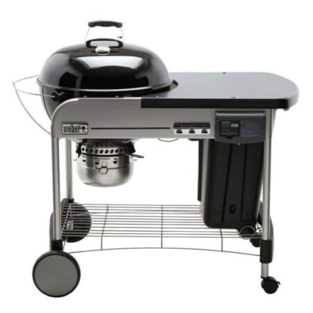 Get the same high-performance kettle BBQ grill that is synonymous with the Weber name, now outfitted with a heavy duty steel cart, push-button ignition system, side table, charcoal bin and LCD timer. The Weber Performer Deluxe 22 in. Charcoal Grill also boasts the Tuck-Away lid holder that acts as a pair of extra hands to cradle the lid while you tend to the main course. The cooking platform is a 363 sq. in. Gourmet BBQ System hinged cooking grate with a removable center section that accommodates separately-sold Weber cooking components. After you have feasted on a finger-licking meal, simply pivot the three damper blades in the kettle basin to funnel charcoal dust into the removable ash catcher underneath. Gourmet BBQ system hinged plated steel cooking grate has a 363 sq. in. cooking area, compatible with other BBQ system separately-sold cookware (wok, griddle, sear grate, pizza stone) Weber Performer Deluxe Charcoal Grill includes electronic touch-and-go gas ignition system; uses separately-sold 14.1 oz. or 16.4 oz. disposable liquid propane canisters Steel cart frame includes: 1 char bin weather protected charcoal container, 1 removable LCD timer, 3 tool hooks, 1 wire bottom rack, 1 painted metal side table, 2 locking caster wheels and 2 all-weather 8 in. rubber-molded wheels Portable backlit LCD cook timer displays countdown time; take it with you or secure it to the Weber charcoal grill cart Turn your Weber Performer Deluxe Charcoal grill into a smart grill with the Weber Connect smart grilling hub Black performer deluxe 22 in. kettle and lid constructed with high-grade porcelain enamel The Weber Performer Delue Charcoal Grill includes 1-touch cleaning system with 3 aluminized steel rust-resistant dampers, which regulate airflow while cooking and sweep ash after grilling Includes large-capacity removable ash catcher to easily dispose of coal ashes Lid has a handle with heat shield, built-in thermometer and adjustable damper with 4 air vents Includes: 2 char basket charcoal holders for indirect heat grilling, 1 tuck away lid holder and 1 steel charcoal grate 10-year limited warranty on lid and bowl